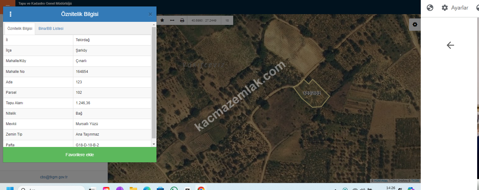 Tekirdağ Şarköy Çınarlı Mahallesi Satılık Üzüm Bağı