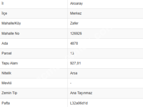 Aksaray Zafer mahallesinde bulunan arsamız 4878 Ada 13 Parselinde bulunmaktadır. Arsamız 927 m2'dir.