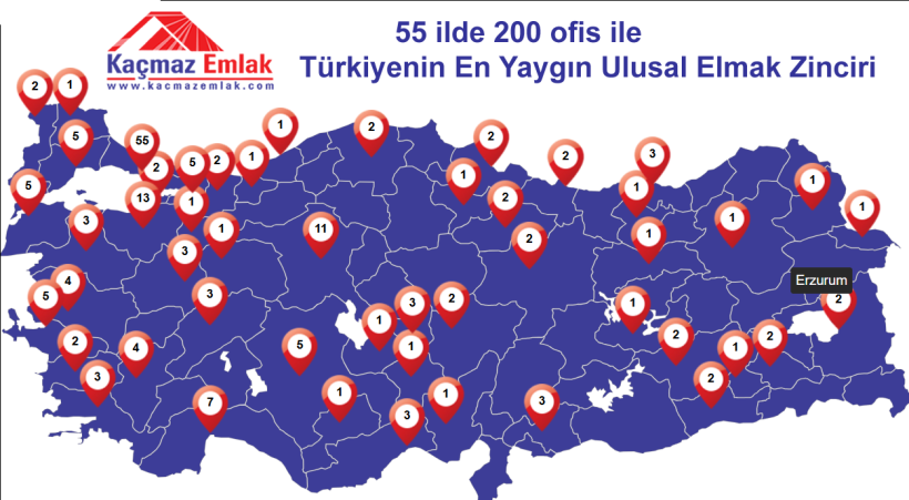 Kaçmaz Emlak İzmir ofisleri, sektördeki güçlü konumunu hem yaygın ofis ağı hem de sunduğu yenilikçi hizmetlerle perçinlemektedir. Kaçmaz Emlak, Türkiye genelinde 55 ilde 200’den fazla ofisiyle yerli emlak zincirleri arasında en yaygın ve hızlı büyüyen markalardan biridir. İzmir’de Aliağa’dan Bayraklı’ya kadar farklı ilçelerdeki temsilcilikleriyle geniş bir müşteri kitlesine ulaşmaktadır.